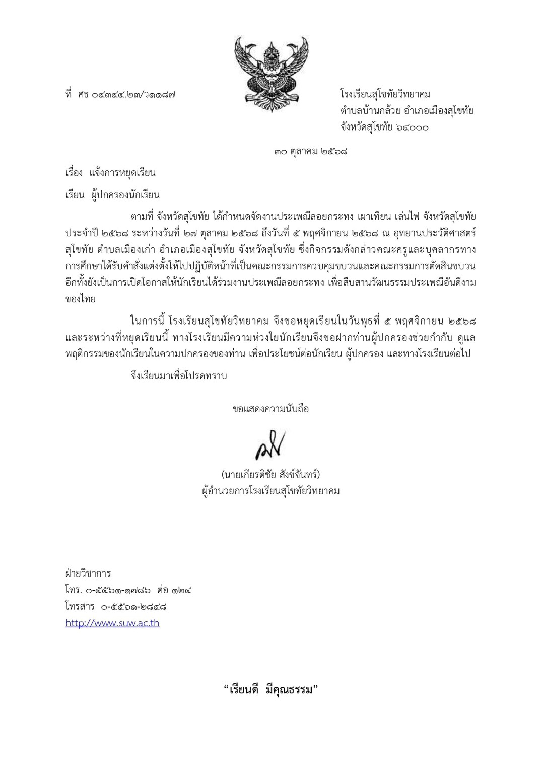 หนังสือแจ้งการหยุดเรียนวันที่ 5 พฤศจิกายน 2568