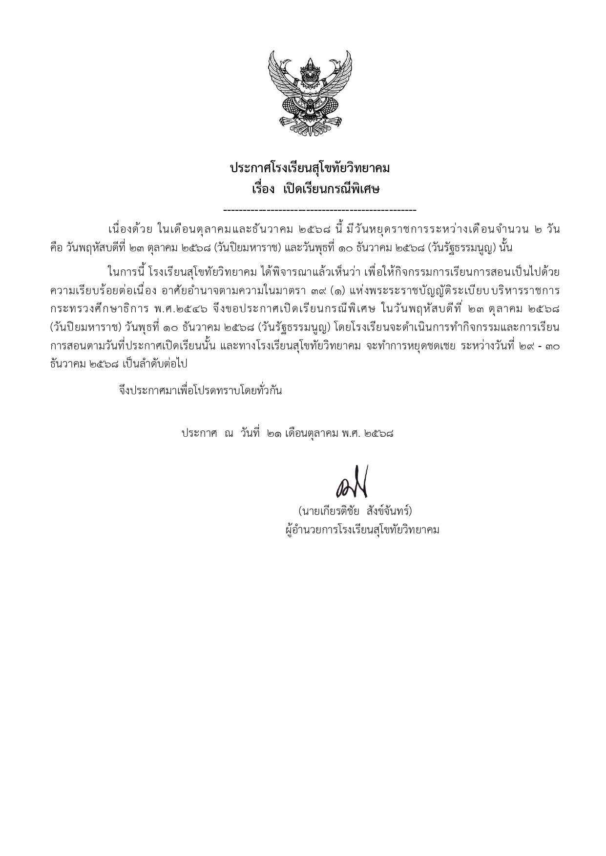 ประกาศโรงเรียนสุโขทัยวิทยาคม เรื่อง เปิดเรียนกรณีพิเศษ