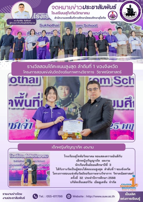 มอบรางวัลการสอบได้คะแนนสูงสุด ลำดับที่ 1 ของจังหวัด โครงการสอบแข่งขันวัดอัจฉริยภาพทางวิชาการ วิชาคณิตศาสตร์