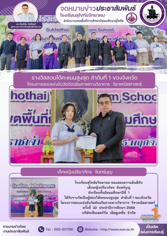 มอบรางวัลการสอบได้คะแนนสูงสุด ลำดับที่ 1 ของจังหวัด โครงการสอบแข่งขันวัดอัจฉริยภาพทางวิชาการ วิชาคณิตศาสตร์
